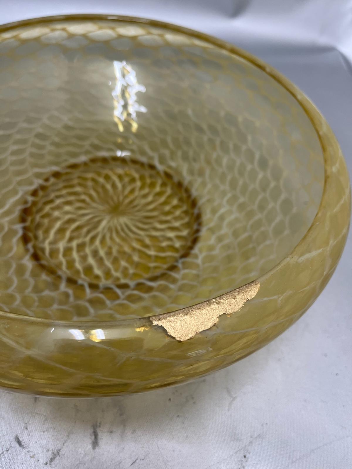 Kleine krasjes aan de binnen- en buitenzijde kunnen zichtbaar blijven. Slijpen doen wij niet. Ontbrekende delen kunnen niet met echt glas worden aangevuld, maar in sommige gevallen gebruiken wij een epoxy, al dan niet op kleur gebracht. Soms kiezen eigenaren er juist voor om de breuk zichtbaar te laten en deze te accentueren met goud volgens de Kintsugi-techniek. Ook dit behoort tot de mogelijkheden binnen glas restauratie, bijvoorbeeld bij kunstobjecten zoals glazen koffiekannen van Klaas Gubbels die zijn hersteld met Kintsugi.